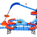 Trať kombinuje slučky, výškové prechody a rebrík so zábranami v zákrutách, aby autíčko držalo stopu aj vo vysokej rýchlosti.
