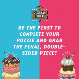 Vyberte si svoj tím – donut alebo cupcake – a odštartujte súboj o titul najrýchlejšieho skladateľa. Každý z vás skladá vlastné puzzle, ale o víťazovi rozhodne posledný obojstranný dielik, ktorý je spoločný pre obe skladačky a čaká v drevenom stojančeku.
