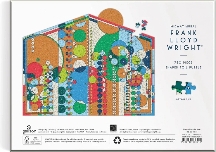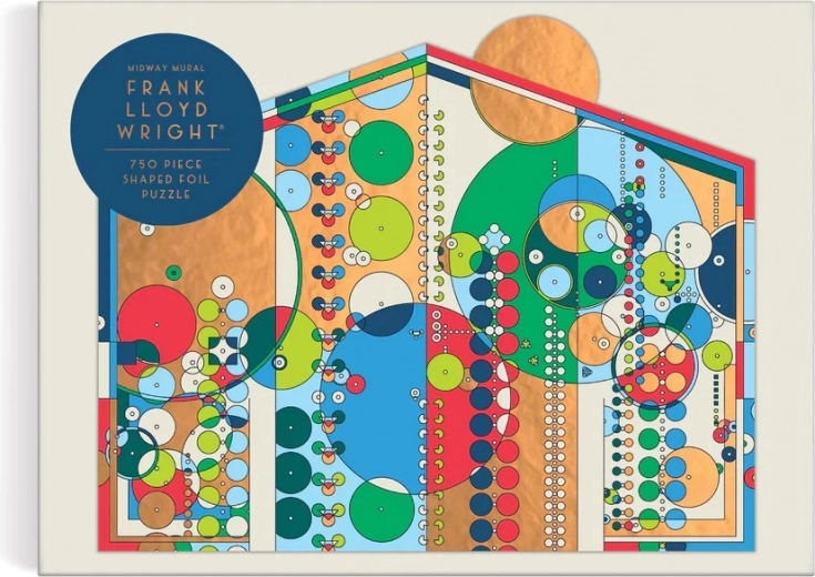 Objavte vizuálne pôsobivé tvarované puzzle s motívom Midway Mural podľa FRANK LLOYD WRIGHTA. Vďaka precízne vyrezaným dielikom, luxusným fóliovým detailom a matnému finišu získate zážitok zo skladania, ktorý zvýrazní farby aj jemné línie geometrického motívu.