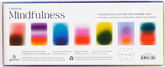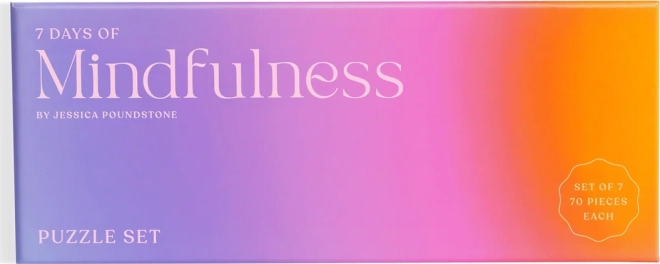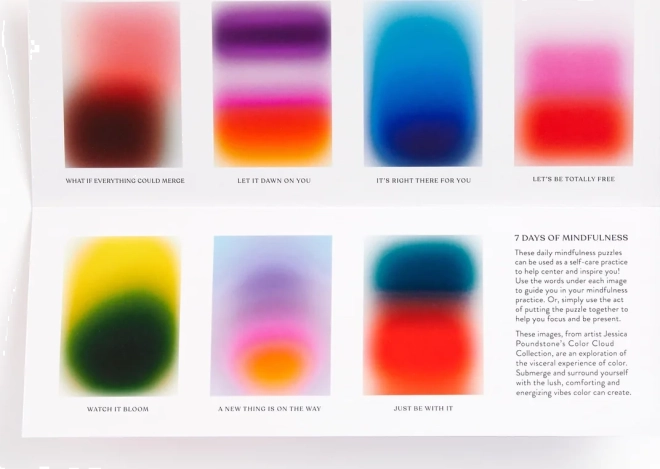 Sada „7 dní mindfulness“ ponúka sedem originálnych mini puzzle s abstraktnými farebnými oblakmi od JESSICA POUNDSTONE. Každé puzzle má 70 dielikov a po zložení meria približne 17,8 × 12,7 cm – ideálna veľkosť na krátke, upokojujúce skladanie doma aj na cestách. Balenie je esteticky spracované a z recyklovaného papiera, čo poteší milovníkov dizajnu aj udržateľnosti.
