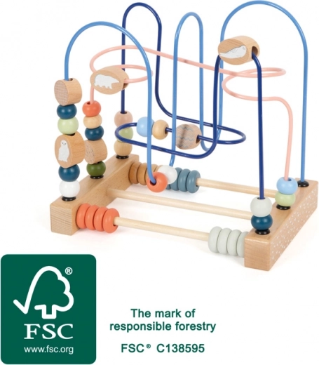 Tento motorický labyrint je vyrobený z certifikovaného dreva FSC® a ponúka dlhodobú zábavu deťom. Vďaka dreveným korálikom a posuvným prvkom s motívmi ľadového medveďa, tuleňa a sovy snežnej sa deti skvele zabavia, zatiaľ čo rozvíjajú svoju jemnú motoriku a koordináciu ruka-oko. Počítadlá s krúžkami prinášajú ďalšie možnosti hier a učia deti počítanie zábavnou formou.