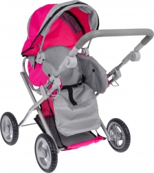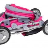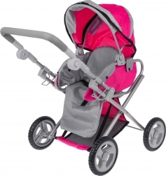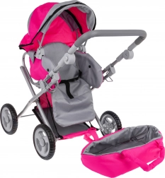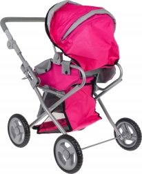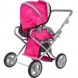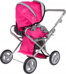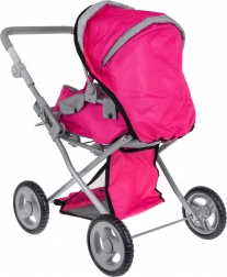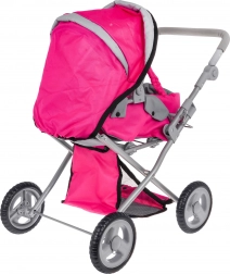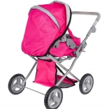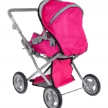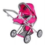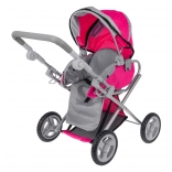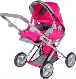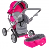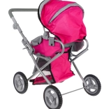 Štýlový ružový kočík pre bábiky 2 v 1 pre deti od 3 rokov. Ponúka vyberateľnú gondolu aj športové sedenie, nastaviteľnú rukoväť 30–54 cm, bezpečnostné pásy, polohovanie sedadla a skladaciu striešku. Vďaka ľahkej kovovej konštrukcii a možnosti rýchleho zloženia na transport sa skvele hodí domov aj na cesty; nechýba ani sieťovaný košík na doplnky.