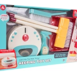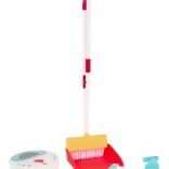 Súčasťou je bohaté príslušenstvo pre kompletnú upratovaciu hru: metla s lopatkou na stojane, kefka a bezpečná atrapa čistiaceho prostriedku. Sada je ideálna na nácvik jemnej motoriky, zodpovednosti a každodenných návykov.