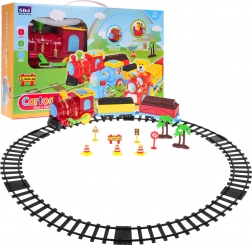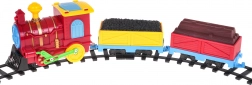 Súprava obsahuje lokomotívu, 2 vozne a koľaje do kruhu s priemerom cca 72,5 cm, plus značky, kužele a stromčeky.