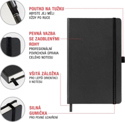 Pevné dosky, elastická gumička, vnútorné vrecko a pútko na pero chránia obsah a udržiavajú všetko pekne pokope – od vizitiek po rýchle poznámky.