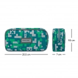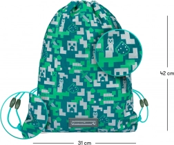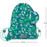 Pixelová grafika s motívom Silver Creeper v tyrkysovo‑zelených tónoch dokonale ladí na oboch kusoch, takže deti budú mať svoje školské vybavenie štýlovo zladené. Praktické detaily, ako pevný zips na peračníku a sťahovanie na šnúrky na vaku, uľahčujú každodenné používanie.