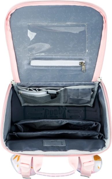 Výklopný systém otvárania, vnútorný organizér s gumičkou, priehľadné vrecko na rozvrh a izolované predné vrecko na desiatu či drobnosti.