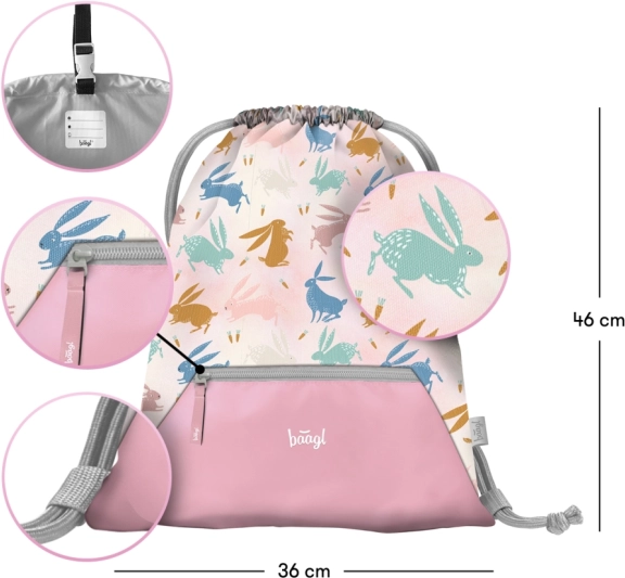 Roztomilý a ergonomický školský set BAAGL Zippy Bunny pre prvý stupeň ZŠ zahŕňa ľahkú aktovku s nastaviteľným chrbtovým systémom, mäkký jednoposchodový peračník a praktické vrecko s vreckom. Vďaka reflexným prvkom, vodoodolným materiálom a premyslenej organizácii je ideálnou voľbou na bezpečné a pohodlné každodenné nosenie.