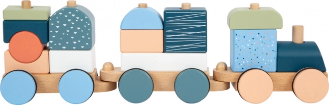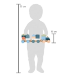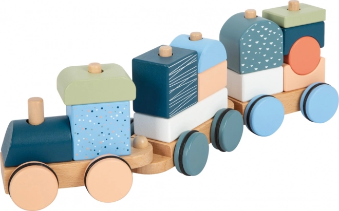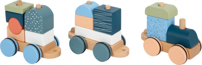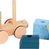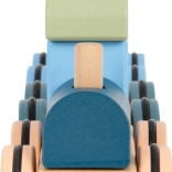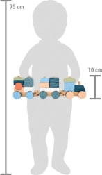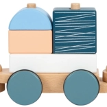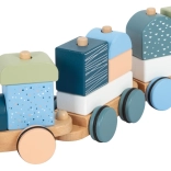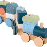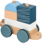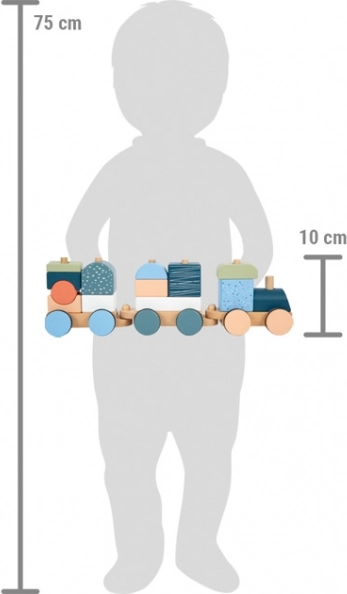 Vláčik je zároveň stohovacia skladačka – 13 dielov možno zasúvať, kombinovať a používať aj samostatne ako stavebné kocky.