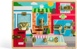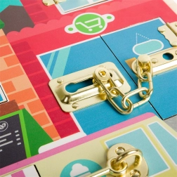 Rôznorodé mechanizmy – preklápacia západka, závora, pánty, reťazový posuvný zámok, západka visiaceho zámku, otočná západka aj háčik s okom – pomáhajú deťom porozumieť bežným domácim uzáverom a zlepšujú presnosť pohybov. Doska je vyrobená z zodpovedne získaného dreva a odolných kovových prvkov.