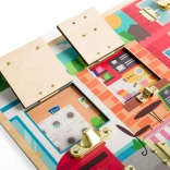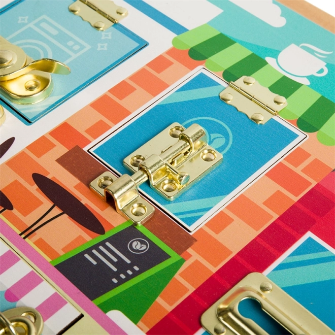 Táto kvalitná drevená motorická doska v štýle Montessori prináša deťom bezpečný priestor na tréning úchopu, trpezlivosti a riešenia problémov. Za každými dvierkami s iným typom uzáveru sa skrýva farebná scéna (práčovňa, kuchyňa, kaviareň a ďalšie), ktorá motivuje k objavovaniu a posilňuje predstavivosť.