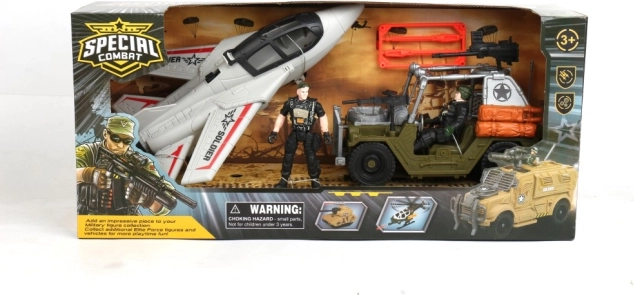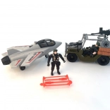 - Vojenské vozidlo, stíhačka, 2 figúrky vojakov, doplnky