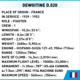 Autentická stavebnica COBI prináša ikonické francúzske stíhacie lietadlo Dewoitine D.520 z obdobia druhej svetovej vojny. V mierke 1:32 vynikne jeho elegantná silueta, historická kamufláž a označenie z obdobia Vichystického Francúzska vytvorené kvalitnou potlačou, ktorá sa neošúcha ani pri intenzívnom hraní. Vďaka pohyblivým prvkom a precíznemu spracovaniu je hotový model pôsobivým zberateľským kúskom aj skvelým exponátom na poličku.