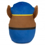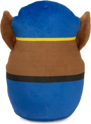Plyšová hračka v tvare psa Chase z obľúbeného seriálu Labková patrola, oblečený v policajnej uniforme s odznakom a šiltovkou.
