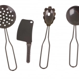 Zahŕňa rôzne kuchynské nádoby vrátane nerezových hrncov, panvíc a misiek pre realistickú hru.