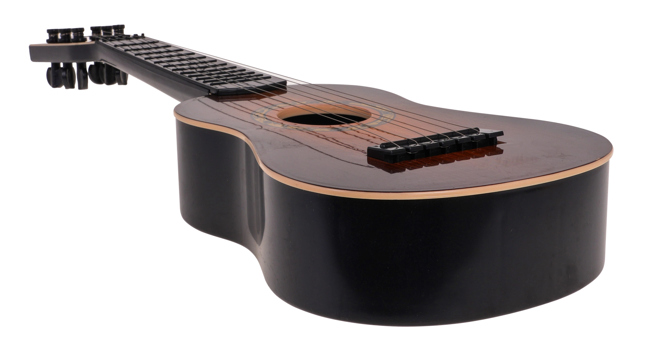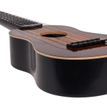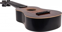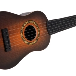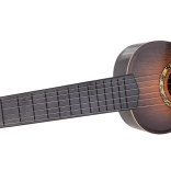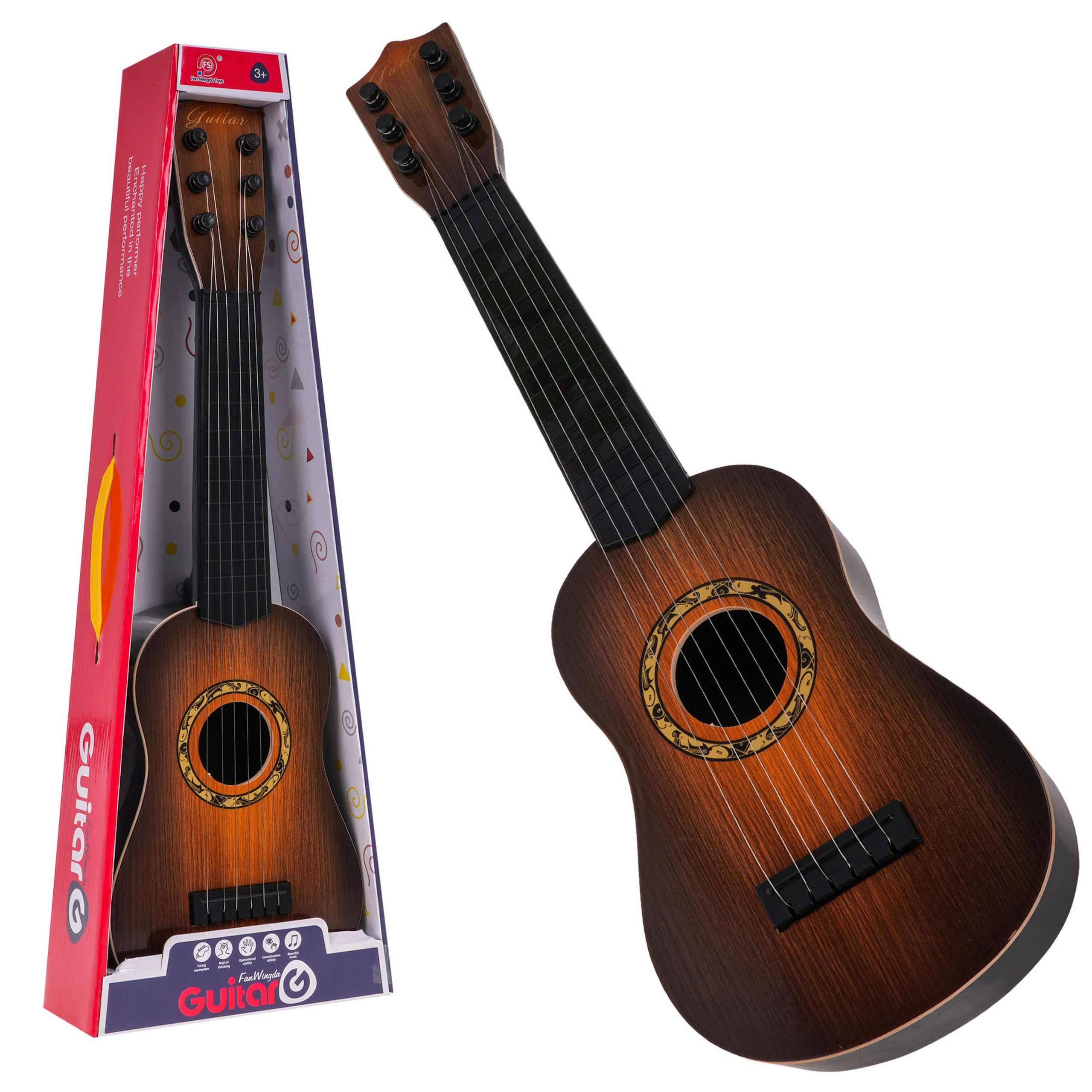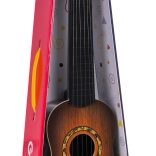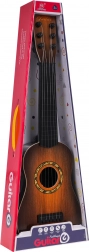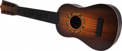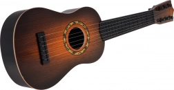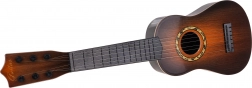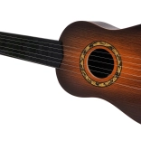 Táto klasická detská gitara v tmavohnedom prevedení verne napodobňuje skutočný nástroj. Má šesť kovových strún a funkčné kolíky na základné ladenie, takže dieťaťu sprostredkuje autentický pocit z hry a motivuje ho k rozvoju rytmu aj sluchu.