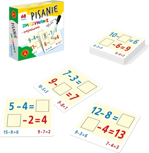 Interaktívna vzdelávacia sada pre deti začínajúce s matematikou. Obsahuje 68 úloh na odčítanie v rozsahu čísel 1–20, ktoré možno riešiť znova a znova vďaka stierateľnému fixu. Neznáma môže byť na rôznych pozíciách v príklade, čo rozvíja logické myslenie, pamäťové počítanie a samostatné hľadanie riešení. Kompaktné balenie je ideálne na cesty a správne výsledky nájdete na zadnej strane kariet.