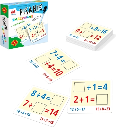 Interaktívna sada pre deti, ktoré začínajú s matematikou: obsahuje karty so 68 úlohami na sčítanie v rozsahu 1–30, kde neznáma môže byť ktorékoľvek z troch čísel v príklade. Vďaka stierateľnému fixu možno úlohy riešiť znova a znova, správne výsledky nájdete na zadnej strane kariet. Kompaktné balenie je ideálne na cesty a podporuje samostatné hľadanie riešení a pamäťové počítanie.