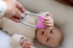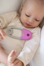 Hrkálka v tvare špendlíka je nevyhnutnou súčasťou výbavy každého dieťaťa. Je navrhnutá tak, aby bola ľahko uchopiteľná pre malé ručičky a svojou ľahkosťou nezaťažovala detské ruky. Jej ružovošedé kontrastné farby zaujmú a podporia vizuálne vnímanie. Deti si obľúbia jemné hrkanie, ktoré prichádza s každým pohybom.