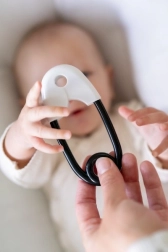Hrkálko v tvare špendlíka je navrhnuté tak, aby podporilo jemnú motoriku a zmyslové vnímanie detí od narodenia. Vďaka svojmu kontrastnému dizajnu upúta pozornosť dieťaťa, zatiaľ čo malé guľôčky vo vnútri poskytujú jemný hrkajúci zvuk.