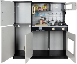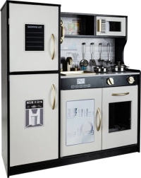 Detská kuchynka XL z kvalitného dreva (MDF) poteší detailným prevedením a odolnosťou. LED lampičku možno umiestniť pod skrinku, do skrinky alebo do rúry, takže si deti užijú atmosféru skutočného varenia aj za šera. Otočné tlačidlá sporáka vydávajú realistické „cvakanie“, čo ešte viac vtiahne do hry.
