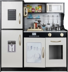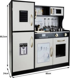 Štýlová drevená kuchynka XL od KRUZZEL v kombinácii čiernej, bielej a zlatej prináša deťom realistickú hru na varenie. Ponúka LED podsvietenie, zvukové efekty horákov, pohybové prvky a bohaté príslušenstvo zadarmo (hrniec, panvica, pokrievka, 4 lyžice). Vyberateľný drez, rúra, mikrovlnka a úložné skrinky na „klik“ podporia kreativitu, učenie hrou a rolové hranie.