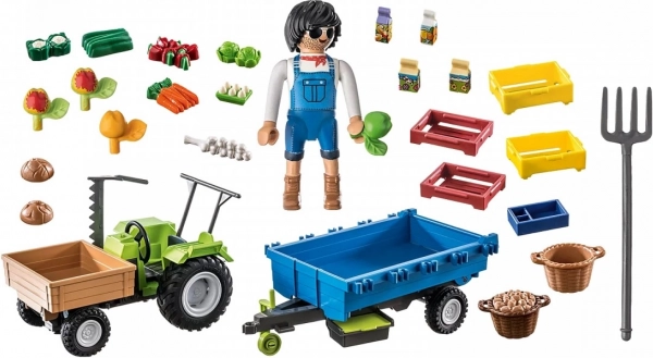 Figúrka farmára, príves, debničky, ovocie, zelenina aj náradie rozširujú herné možnosti a rozvíjajú jemnú motoriku.