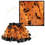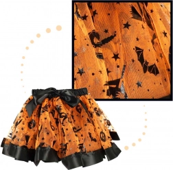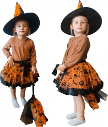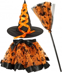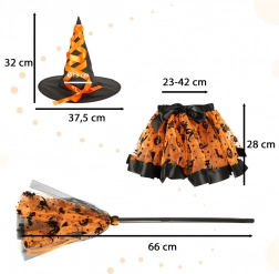 Tento 3-dielny kostým čarodejnice premení každé dieťa na malú čarodejnicu. Ľahká tutu sukňa s elastickým pásom je pohodlná na celodenné nosenie, vysoký špicatý klobúk dodá vzhľadu čarovný nádych a metla sa postará o dokonalé dotvorenie postavy. Oranžová s čiernymi motívmi netopierov, tekvíc a hviezd je výrazná a fotogenická.
