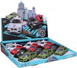 Dostupné sú 4 dizajnové varianty – hasiči, vojenské, polícia SWAT a biele policajné auto – ideálne do zbierky aj ako darček. Model má kompaktné rozmery 13 × 6 × 6 cm a vďaka zotrvačníkovému pohonu ľahko vyrazí vpred po natiahnutí.