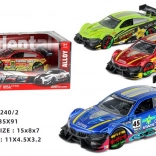 Kovové pretekárske auto s rozmermi 11x4,5x3,2 cm ponúka zábavu na spätné natiahnutie v troch farebných variantoch - zelená, červená a modrá.