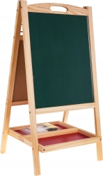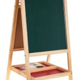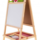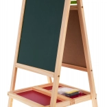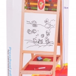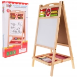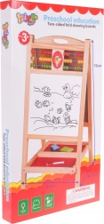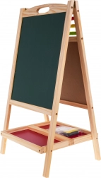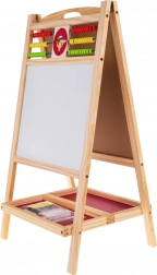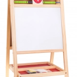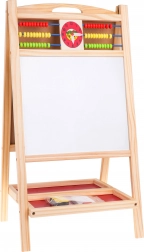 Drevená obojstranná tabuľa s počítadlom je skvelá vzdelávacia hračka pre deti od 3 rokov. Táto multifunkčná tabuľa má jednu stranu bielu magnetickú a druhú kriedovú. Na bielu stranu môžete písať fixkou, ktorá je súčasťou balenia. Fixka je magnetická a má hubku na mazanie. V hornej časti tabule je umiestnené počítadlo a hodiny s pohyblivými ručičkami. Na kriedovú stranu možno kresliť kriedami, ktoré sú súčasťou balenia, a potom všetko vymazať hubkou.