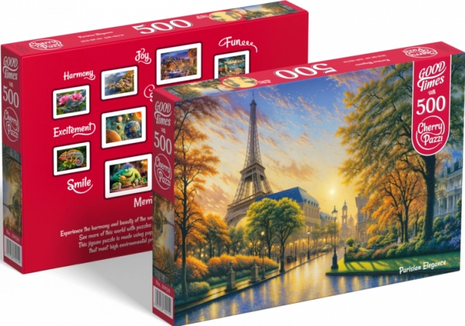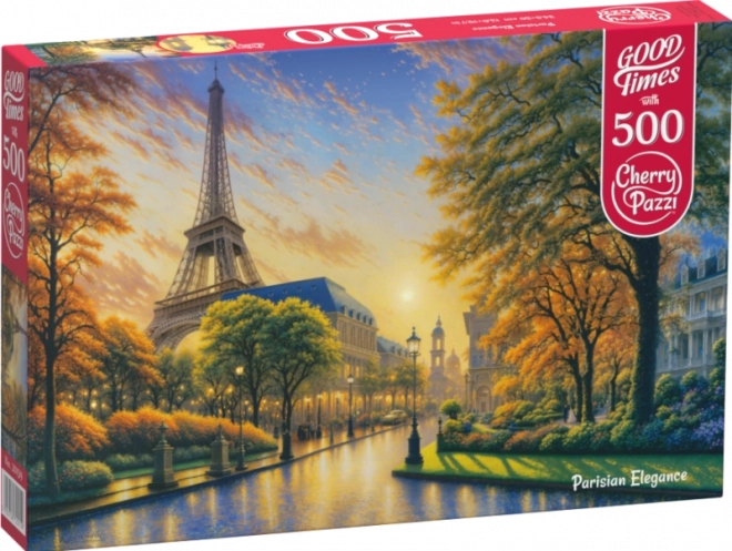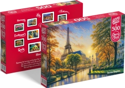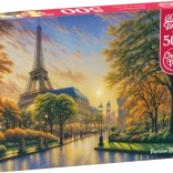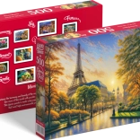 Puzzle predstavuje detail Eiffelovej veže v Paríži počas zlatého západu slnka, čo vytvára romantickú atmosféru.