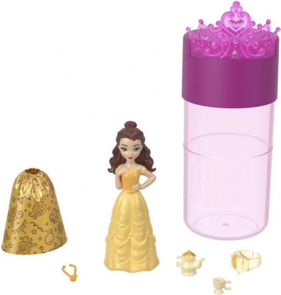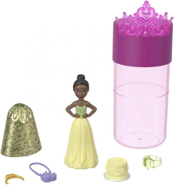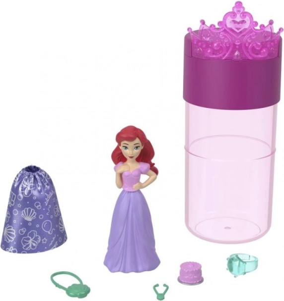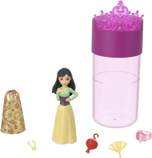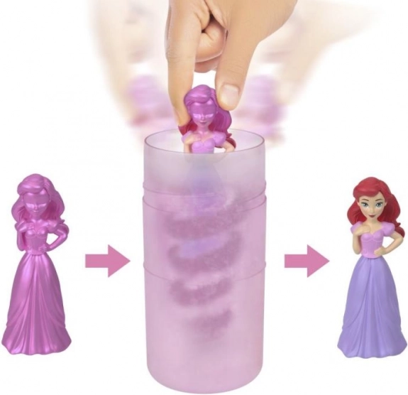 Začnite rozbalením tuby, v ktorej nájdete malú tajomnú bábiku (cca 3,5"/9 cm) potiahnutú vrstvou Color Reveal a tri sáčky s doplnkami. Naplňte tubu vodou, ponorte bábiku a jemne s ňou zatočte – behom chvíľky sa odhalí jej charakteristický vzhľad inšpirovaný obľúbenými filmami Disney.