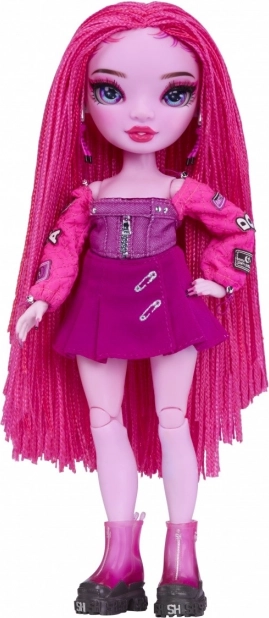 Bábika má živé ružové prepletené vlasy, výrazné modré oči a detailné tvárové prvky, ktoré podčiarkujú jej štýlový vzhľad.