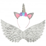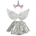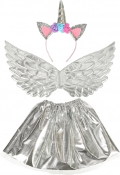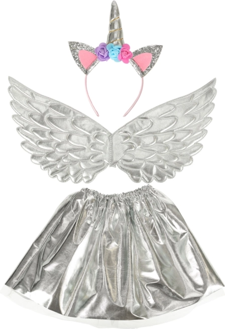 Tento nádherný kostým vám umožní premeniť vaše dieťa na jedinečného jednorožca. Skladá sa z striebornej sukne, elegantných krídel a detailne spracovanej čelenky s ružami. Ideálny pre každú príležitosť, kde si dieťa môže užiť rozprávkovú hru.