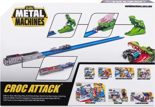 Zuru Metal Machines Krokodílí útok je autodráha, ktorá vás vtiahne do sveta akčnej zábavy. Vydajte sa v ústrety nebezpečnému krokodílovi, ktorý číha na váš Monster Truck. Dosiahnite dostatočnej rýchlosti, aby ste krokodílie čeľuste prekonali v bezpečí.