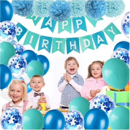 - sada dekorácií sa skladá z balónikov, pom-pomov a girlandy Happy Birthday,
