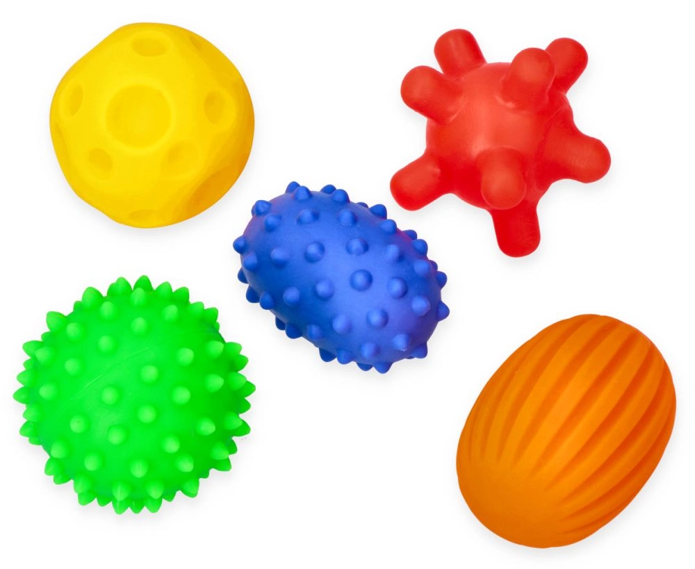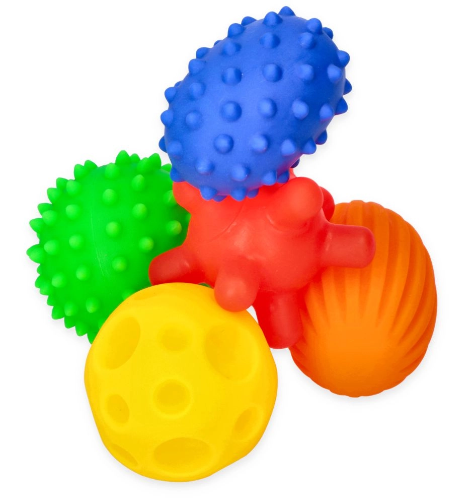 Sada 5 farebných senzorických loptičiek s výstupkami, bodlinkami a ryhovaním podporuje vnímanie tvarov a povrchov, sústredenie aj prirodzený rozvoj zmyslov. Vďaka mäkkému materiálu sa loptičky ľahko uchopujú drobnými rúčkami, sú vhodné na hranie doma, na deke aj vo vani.