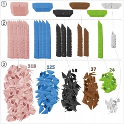 - papierové moduly, 2× papierové nohy plameniaka, 2× tyčky, 1× arch nálepiek, 1× tlačený návod