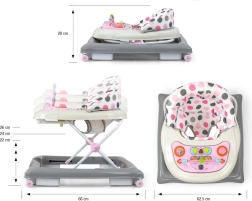 Výrobok má vzdelávací panel, ktorý obsahuje množstvo prekvapení čakajúcich na malých objaviteľov: svetielka, píšťalky, melódie, hrkálku, tlačidlá a ďalšie pohyblivé prvky. Po vybratí panelu z vaničky chodítka ho možno používať ako samostatnú hračku, napr. ako spoločníka na cesty, a hornú časť možno použiť ako hrací stolík.