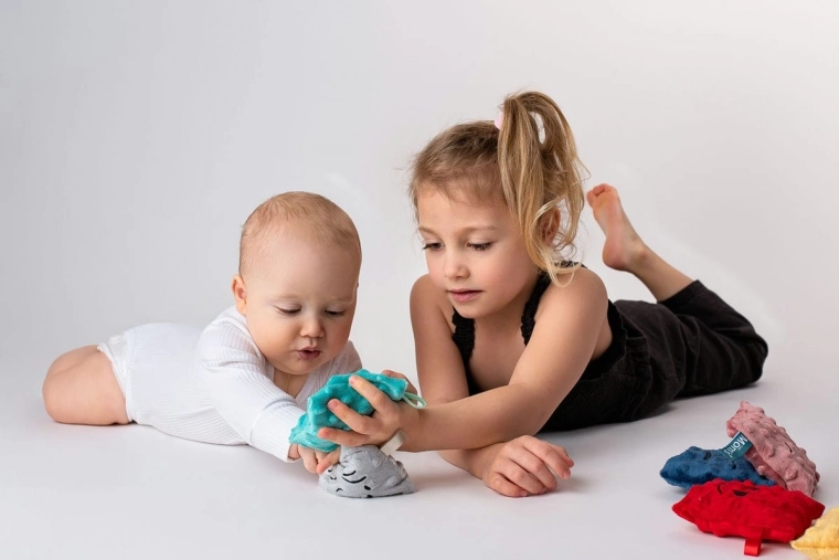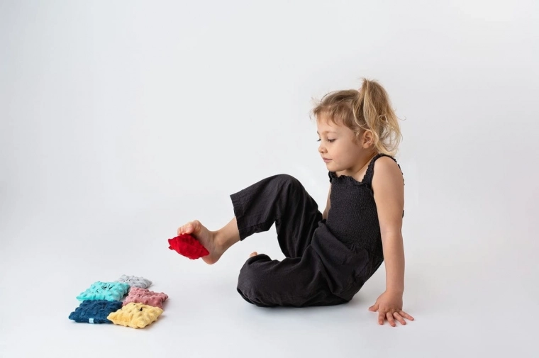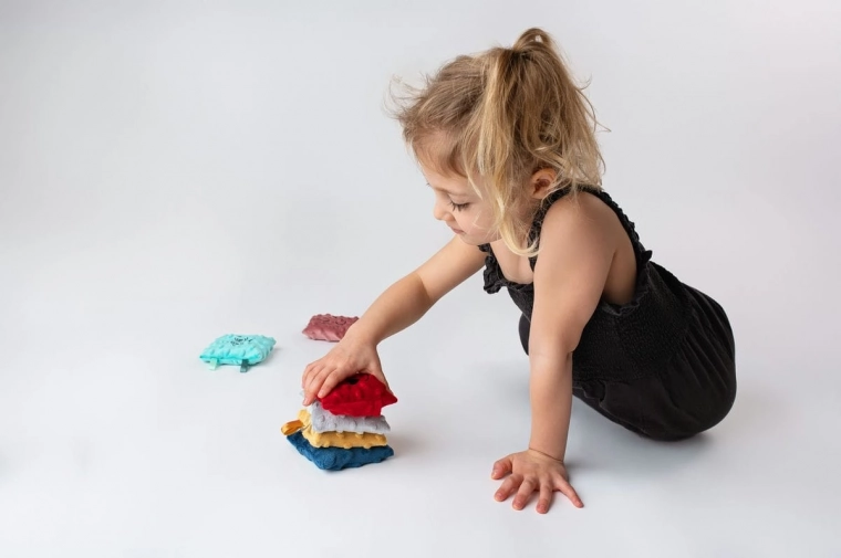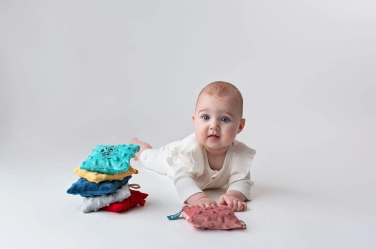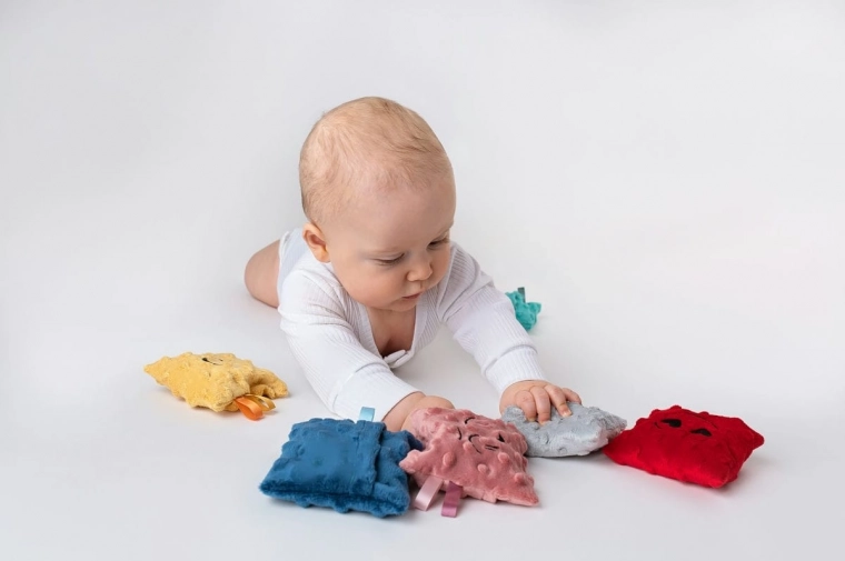 Sada obsahuje 6 farebných vrecúšok s rozdielnymi povrchmi a náplňami: pohánka s levanduľou, hrach, ryža, pšeno, ľanové semienko a čerešňové kôstky. Každé vrecúško prináša odlišné hmatové podnety, ktoré podporujú zmyslovú integráciu a prirodzenú zvedavosť dieťaťa. Odnímateľné mäkké poťahy je možné prať, vnútorné vložky sa dajú čistiť vlhkou handričkou; pre udržanie hygieny ich možno občas vložiť do mrazničky.