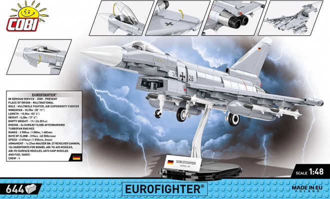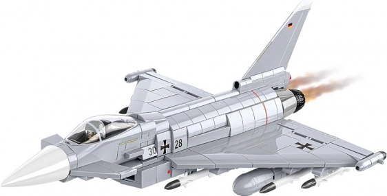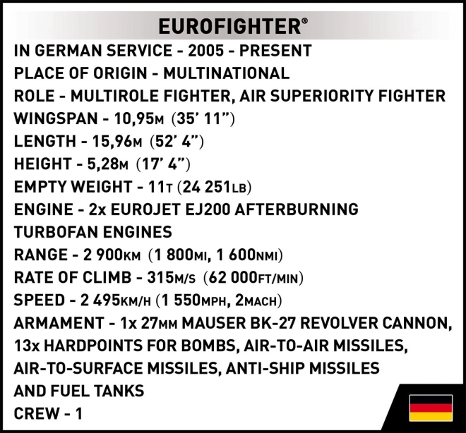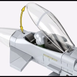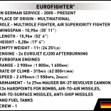 Detailne spracovaný model viacúčelového stíhacieho lietadla EUROFIGHTER TYPHOON vo farbách nemeckého letectva prináša realistické prvky, ako je otváracia kabína, pohyblivé elevóny a možnosť ľahko sňať podvozok pre čistú expozičnú siluetu na priloženom stojane. Vďaka zrozumiteľnému návodu postaví model bez ťažkostí aj menej pokročilý staviteľ.