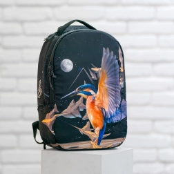 Dizajn batohu zdobí motív rybárika v lete, spolu s abstraktnými tvarmi a mesiacom. Tento výrazný potlač robí z batohu stred pozornosti.