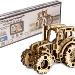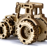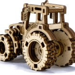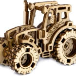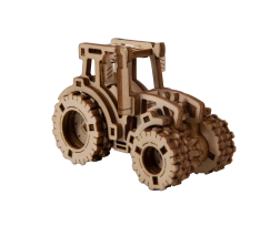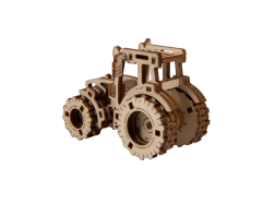 Laserom vyrezané prvky z preglejky vytvárajú realistický vzhľad traktora s ozubením a pneumatikami.