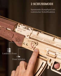 Model zaujme precíznym spracovaním z prírodného dreva, laserovými gravúrami a pohyblivými prvkami, ktoré verne simulujú mechaniku skutočnej zbrane.