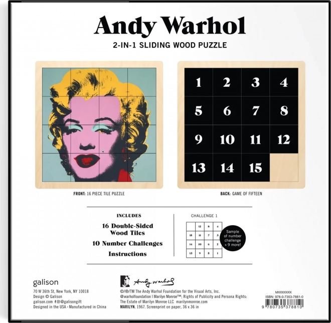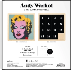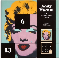 Tieto unikátne posuvné drevené puzzle poskytnú hodiny zábavy a kreatívnej výzvy. Na jednej strane nájdete ikonický motív Andyho Warhola, na druhej matematickú hádanku: Hra o pätnásť. Puzzle o veľkosti cca 15 x 15 cm je konštruované tak, aby vyžadovalo sústredenie a strategiu.