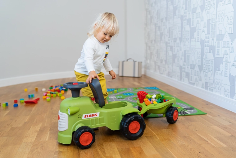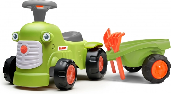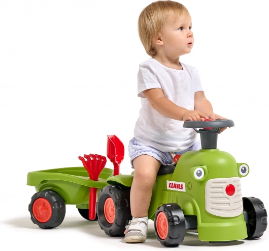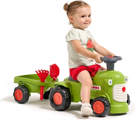 Objavte robustné odrážadlo v dizajne známej poľnohospodárskej značky CLAAS v svetlozelenej farbe. Deti si zamilujú jednoduché ovládanie pomocou volantu s klaksónom a rodičia ocenia bezpečné a stabilné prevedenie. Valník ponúka miesto na hračky a je vybavený praktickými doplnkami – hrabličkami a lopatkou.