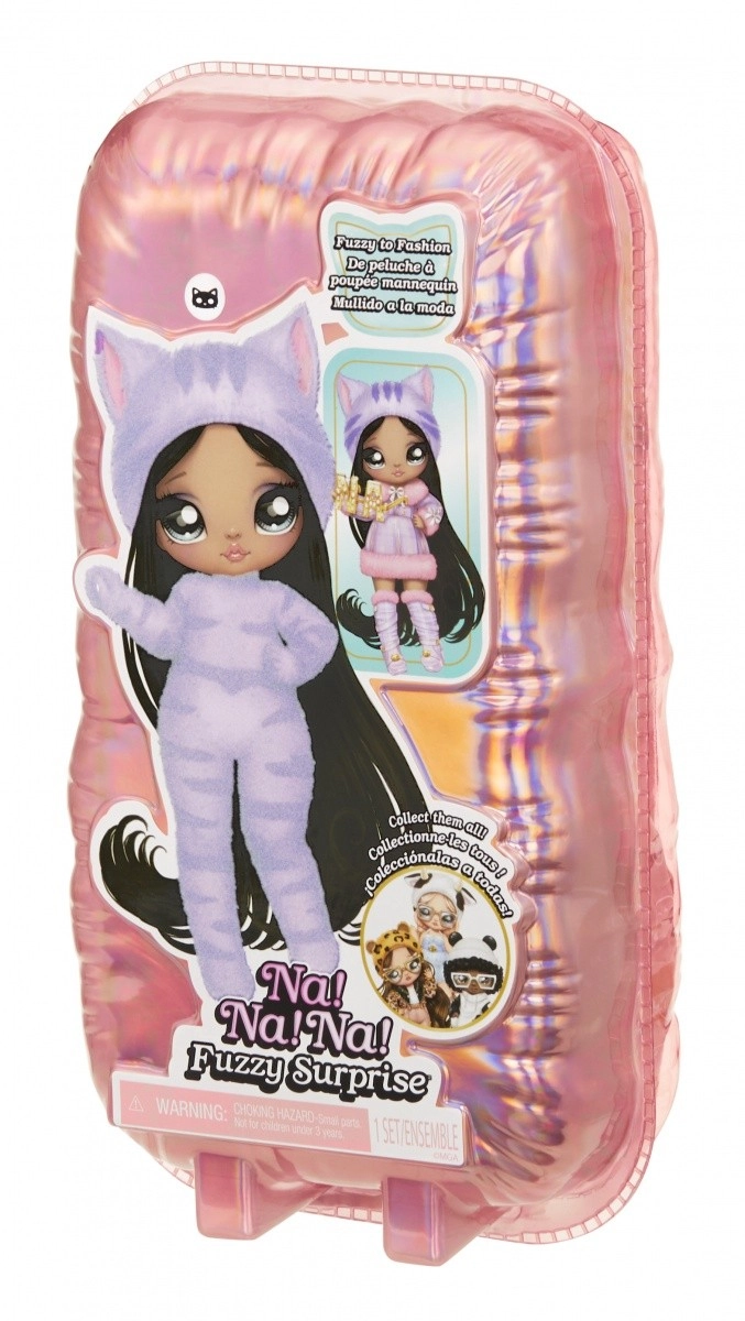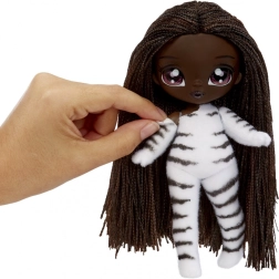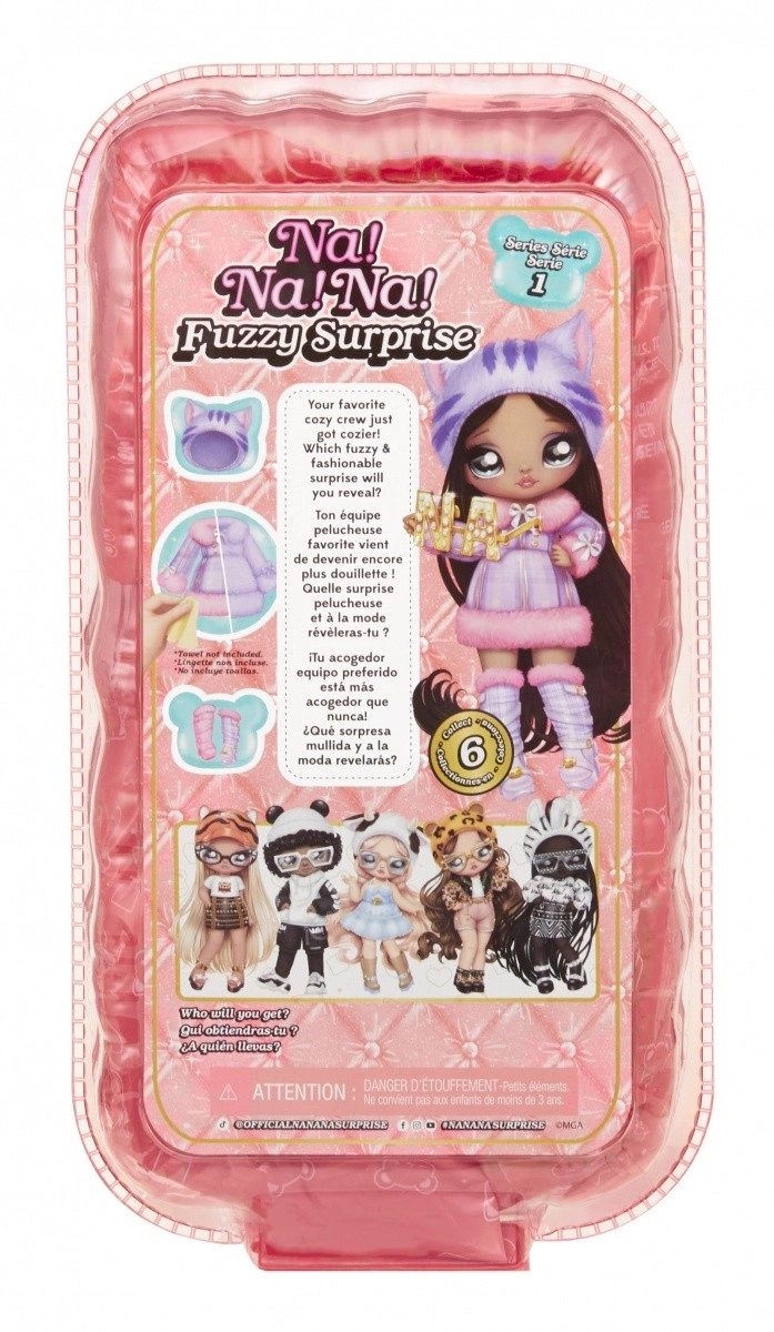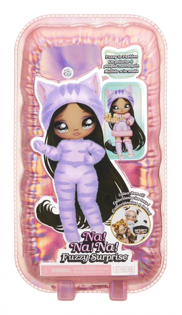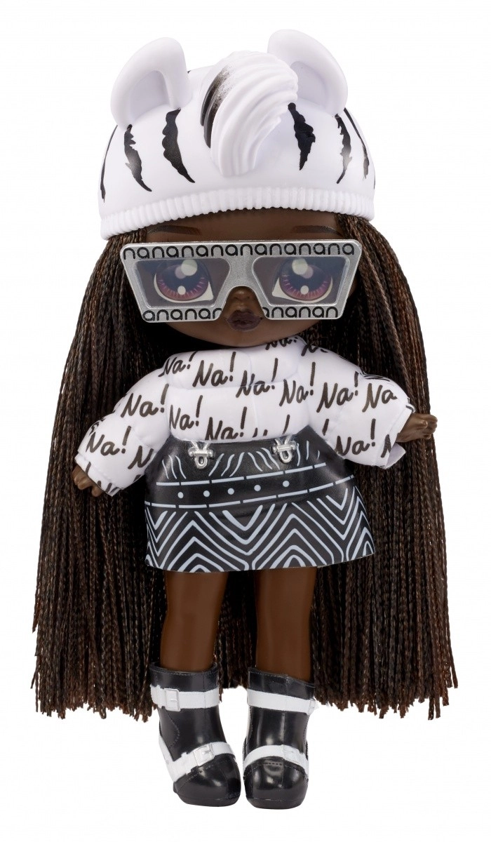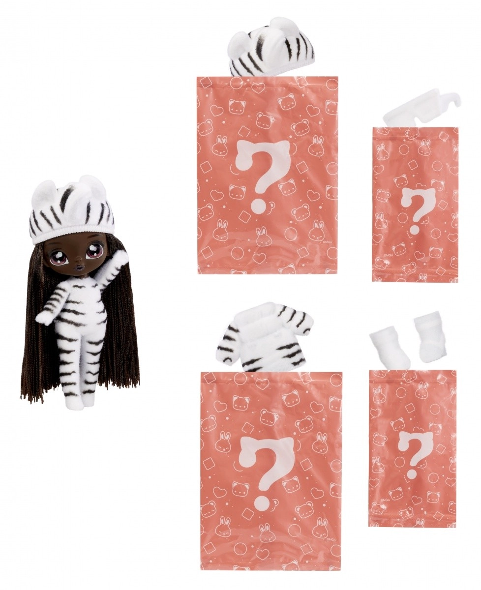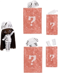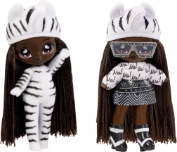 Zažite nové odhaľovanie bábik s kolekciou NA! NA! NA! Fuzzy Surprise. Každá 17 cm bábika má jemné flokované telo, ktoré stačí zotrieť vlhkou handričkou a odkryť tak jej jedinečný vzhľad, výrazné potlače tváre a módne doplnky. Zebra Girl zaujme čiernobielym zvieracím štýlom, odnímateľnou čiapkou s uškami a výraznými okuliarmi.