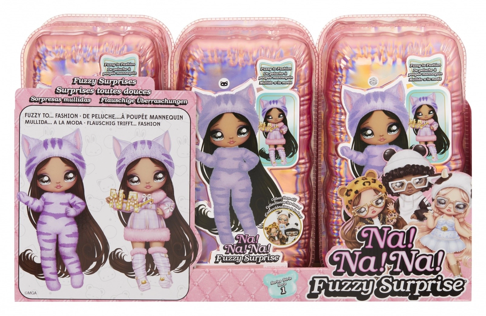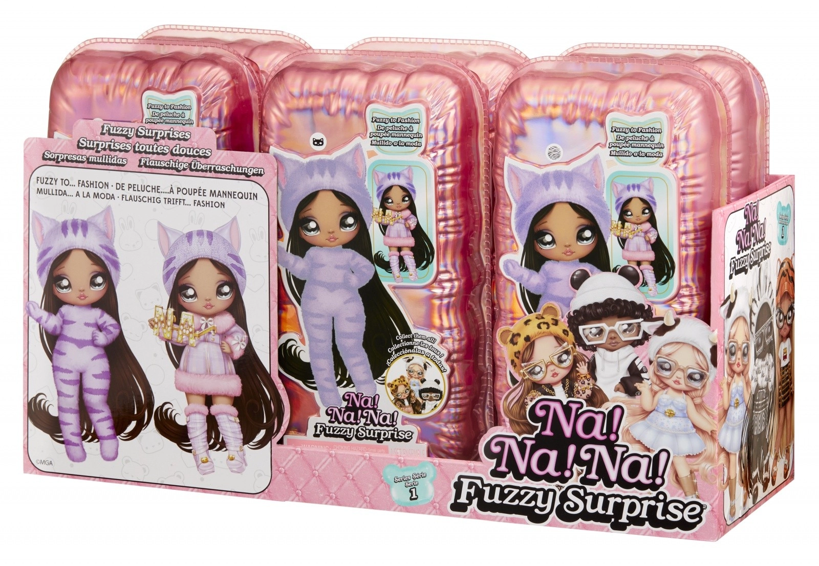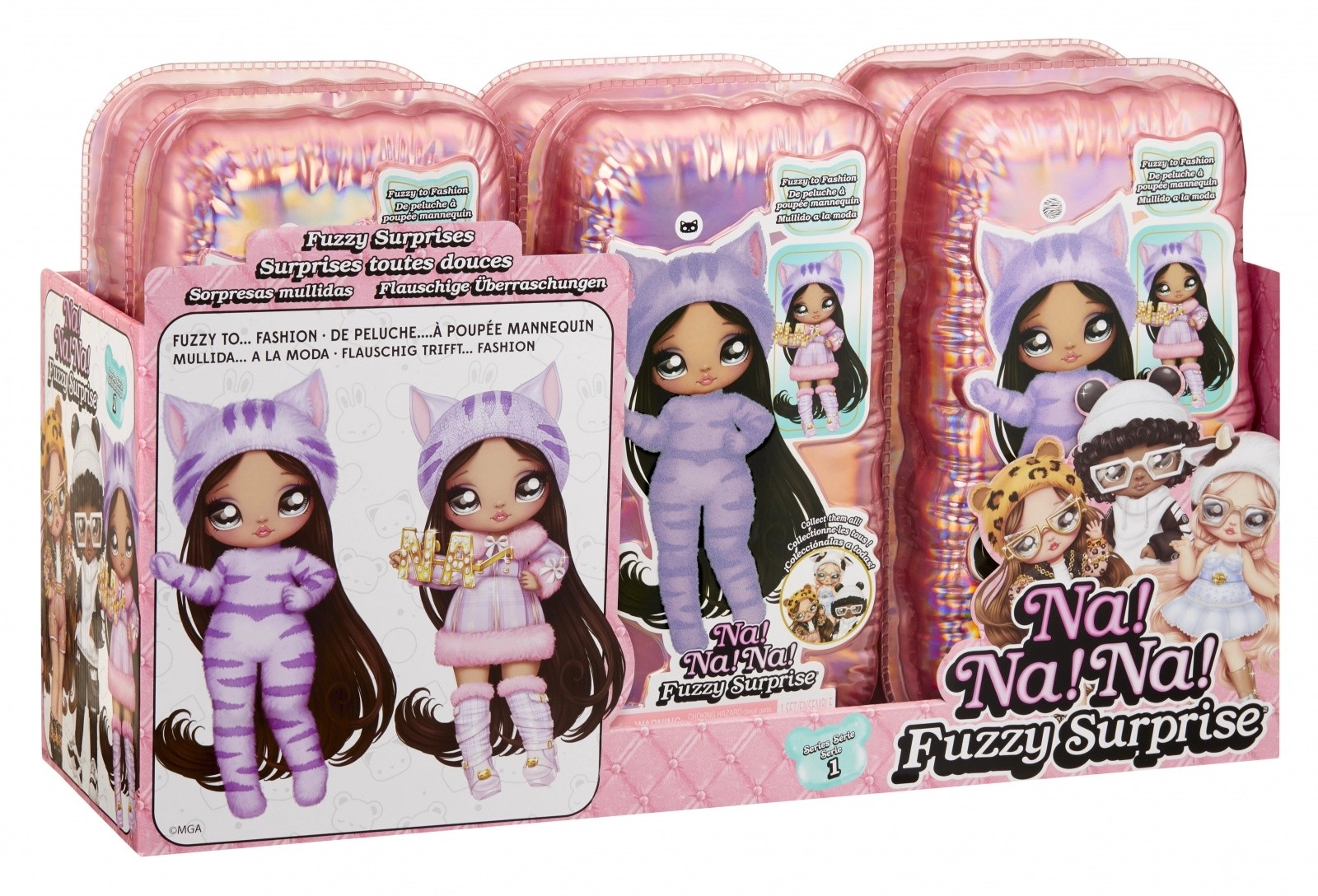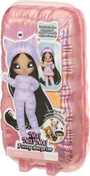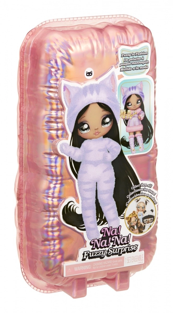 Zažite nové odhaľovanie bábik s kolekciou NA! NA! NA! Fuzzy Surprise. Každá 17 cm bábika má jemné flokované telo, ktoré stačí zotrieť vlhkou handričkou a odkryť tak jej jedinečný vzhľad, výrazné potlače tváre a módne doplnky. Zebra Girl zaujme čiernobielym zvieracím štýlom, odnímateľnou čiapkou s uškami a výraznými okuliarmi.