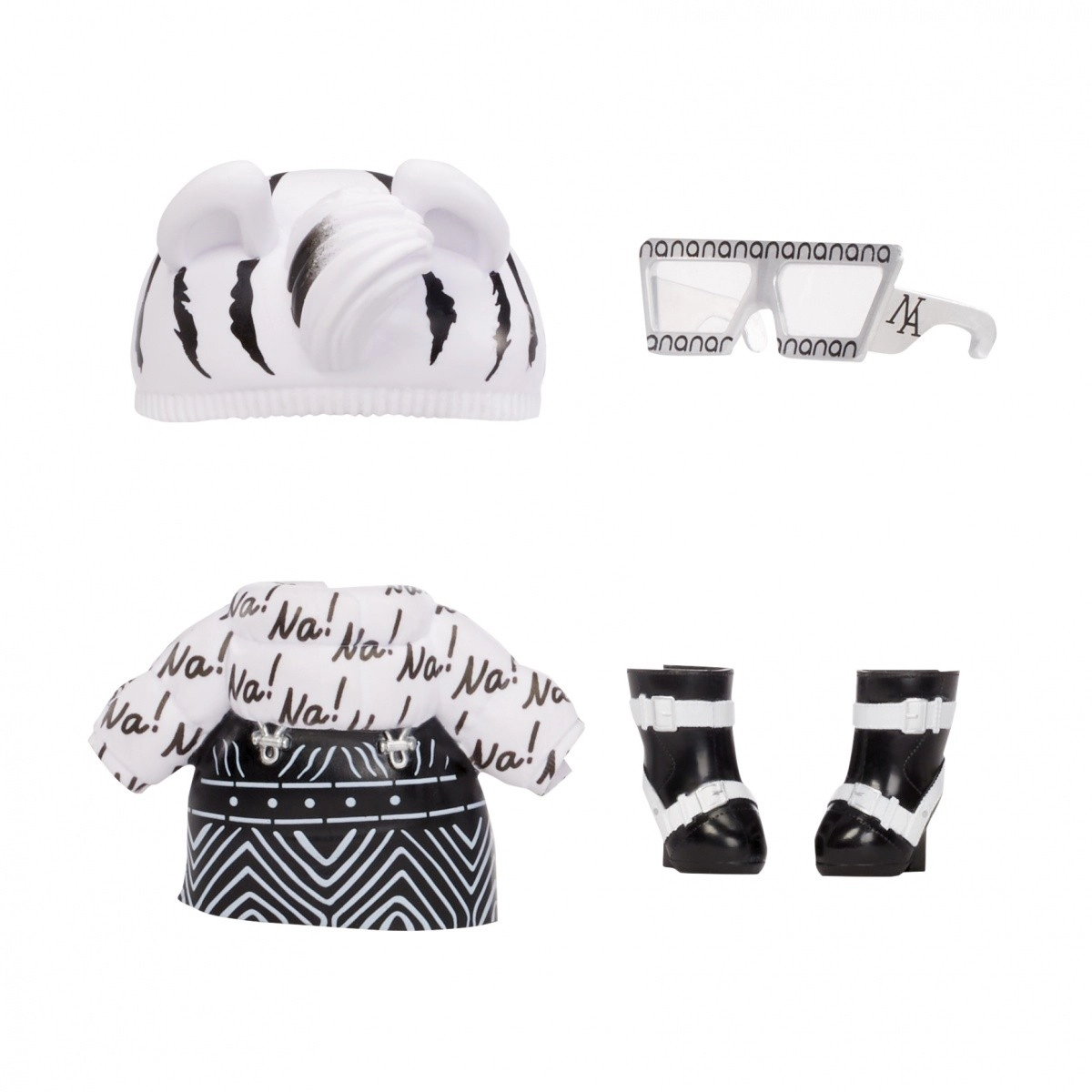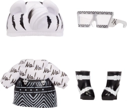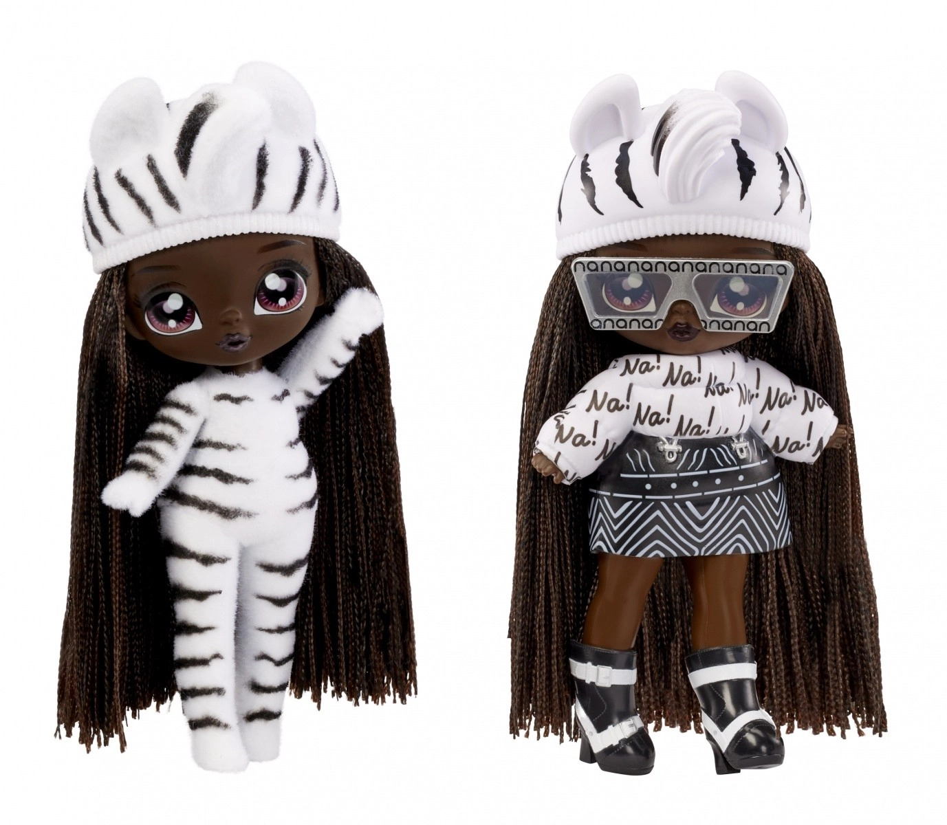 Zebra Girl prichádza v čiernobielom zvieracom looku so sukňou, topom „Na!“, čiapkou s uškami, slnečnými okuliarmi a topánkami – ideálne na módne hranie.